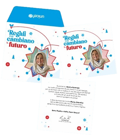 Scegli un regalo solidale da donare insieme all’UNICEF e ricevi una lettera cartacea o un biglietto digitale per dedicare il gesto al destinatario del dono.